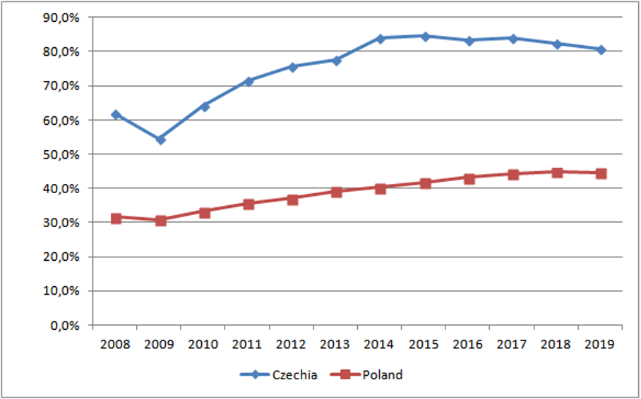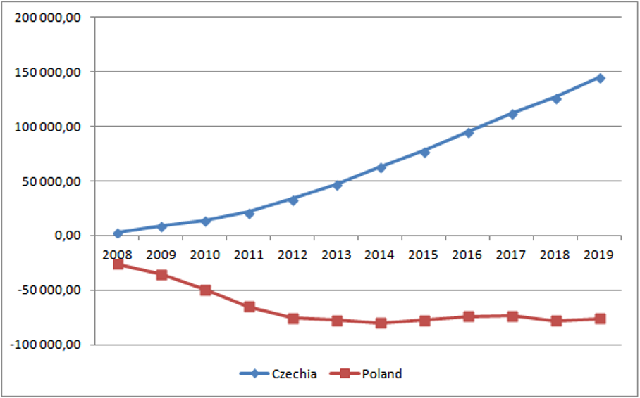 For example, overall trade effects can be shown using real data in the Czechia and Poland case. First, in terms of openness Czechia is more trade-oriented than Poland. In 2019 Czechia openness level (exports/GDP) was 80,7% in comparison to 44,6% in Poland (Fig.3). Then the overall trade effect is visible after calculating a cumulative sum of trade balance for Czechia and Poland from 2008 to 2019. While Poland struggles with its negative trade balance, international trade became a success factor for Czechia’s economy, which reaps the gains of a positive trade balance in a systematic way (Fig.4).